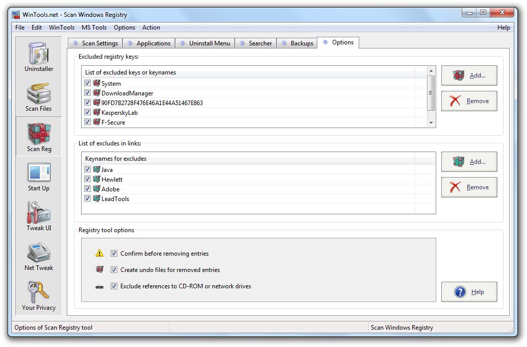 Clean Registry: Options - This contains numerous additional options which configure the Clean Registry tool.